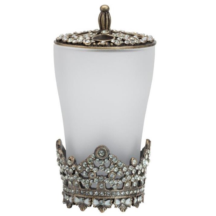 Подставка для зубных щёток Heather изготовлена из стекла, помещена в подстаканник из металлической вязи, инкрустированной стеклянными камешками. На металлической крышке — удобная ручка и четыре отверстия для щёток выгодно дополняют общий дизайн подставки. Изготовлена из совершенно безопасных натуральных материалов. Непременно приобретите её вместе с другими предметами коллекции Heather для вашей ванной комнаты. Такой набор, несомненно, станет и шикарным подарком.
