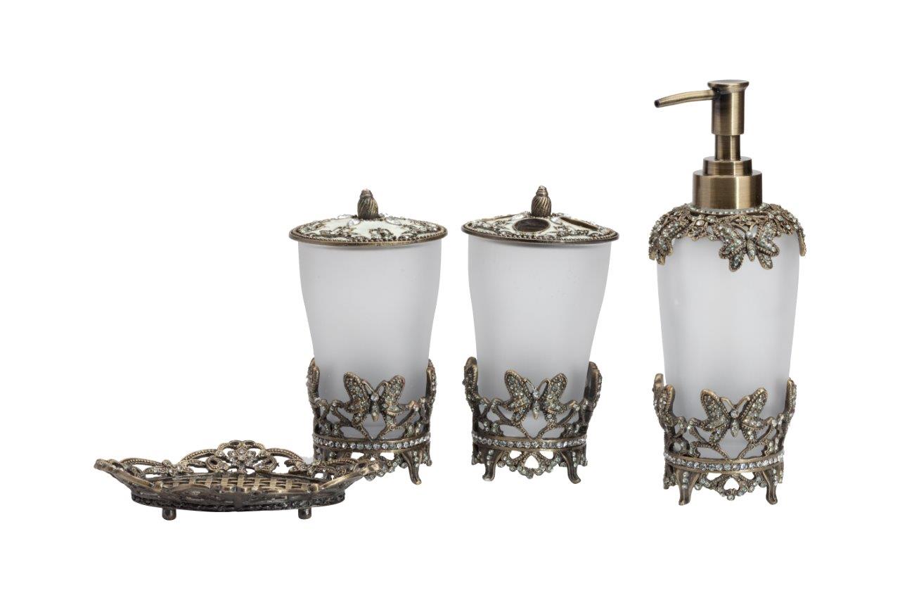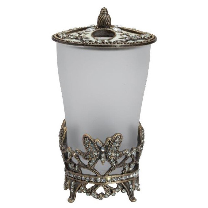 Подставка для зубных щёток Lisette изготовлена из стекла, помещена в подстаканник из металлической вязи в золотом цвете, инкрустированной стеклянными камешками. На металлической крышке — удобная ручка и четыре отверстия для щёток, выгодно дополняют общий дизайн подставки. Изготовлена из совершенно безопасных натуральных материалов. Непременно приобретите её вместе с другими предметами коллекции Lisette для вашей ванной комнаты. Такой набор, несомненно, станет и шикарным подарком.
