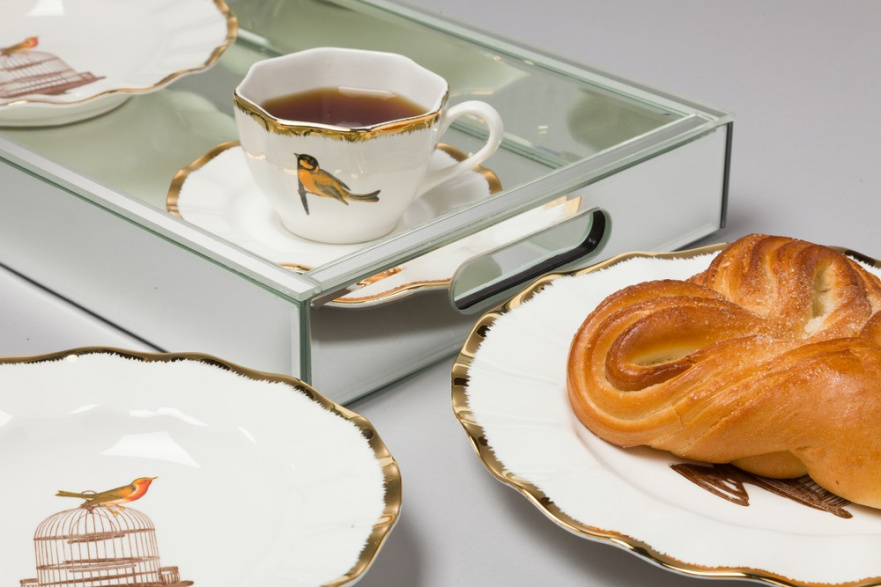Чайная пара Welle из костяного фарфора, украшенная рисунком свободолюбивой птицы, которая буквально выскользнула из клетки присутствующим на тарелках из той же коллекции. В состав пары входят блюдце с золотой окантовкой и кружка с покрытой золотом ручкой. Необычная волнистая форма блюдца подчёркивает невесомость комплекта и утонченность вкуса его обладателя. Идеальный подарок! В той же коллекции Welle в нашем интернет-магазине представлен набор тарелок.
