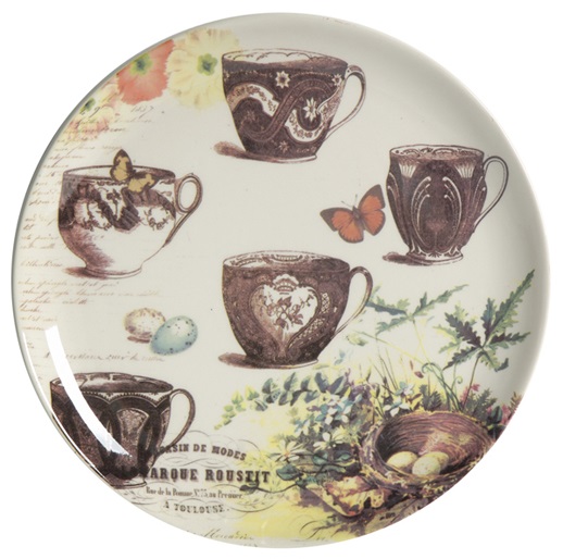 Выполненная из грубой керамики тарелка Grunj диаметром 21 см декорирована разноцветным рисунком с преобладанием коричневого цвета, на котором изображены разнообразные чашки, растения, бабочки, что придаёт ей особую элегантность. Благодаря фантазийному рисунку, тарелка может стать самостоятельным элементом интерьера кухни или столовой и украсит любой дом.